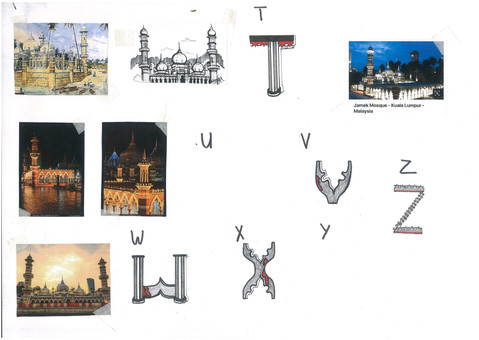 I did the same with Masjid Jamek. Naturally, I was at this mosque and took pictures for myself. And based on that, I created my collages in a sketchbook. And that's what happened as the font was created :